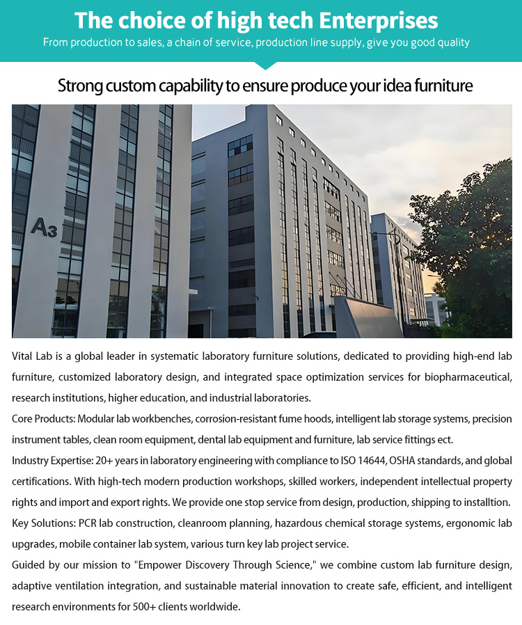 Vital Lab is a global leader in systematic laboratory furniture solutions, dedicated to providing high-end lab furniture, customized laboratory design, and integrated space optimization services for biopharmaceutical, research institutions, higher education, and industrial laboratories.Core Products: Modular lab workbenches, corrosion-resistant fume hoods, intelligent lab storage systems, precision instrument tables, storage cabinet, service fitting, container lab house, lab consumption, lab equipment ect.Industry Expertise: 20+ years in laboratory engineering with compliance to ISO 14644, OSHA standards, CE and global certifications.Key Solutions: PCR lab construction, cleanroom planning, hazardous chemical storage systems, ergonomic lab upgrades ect. Lab furniture design, production, installation ect.